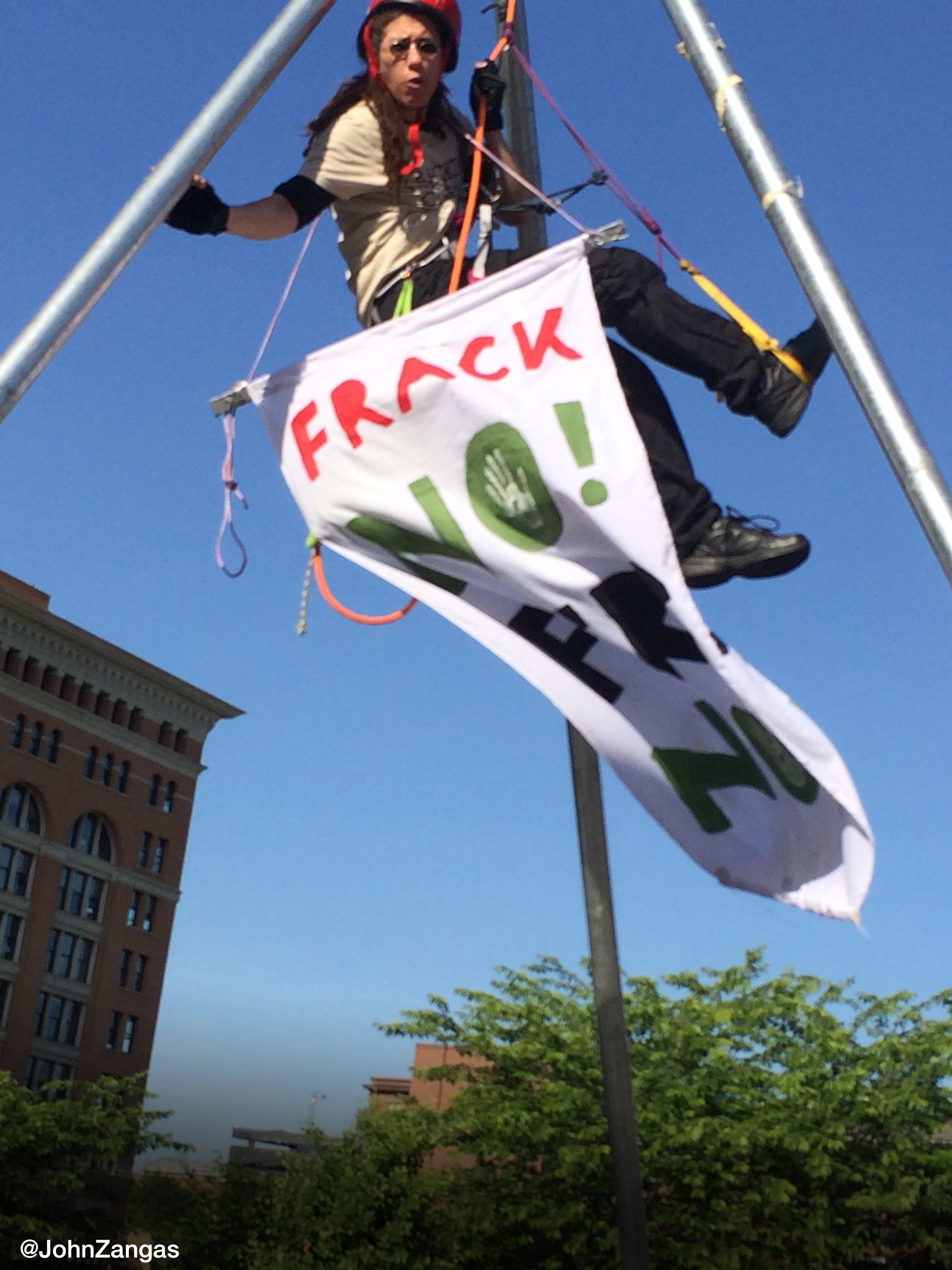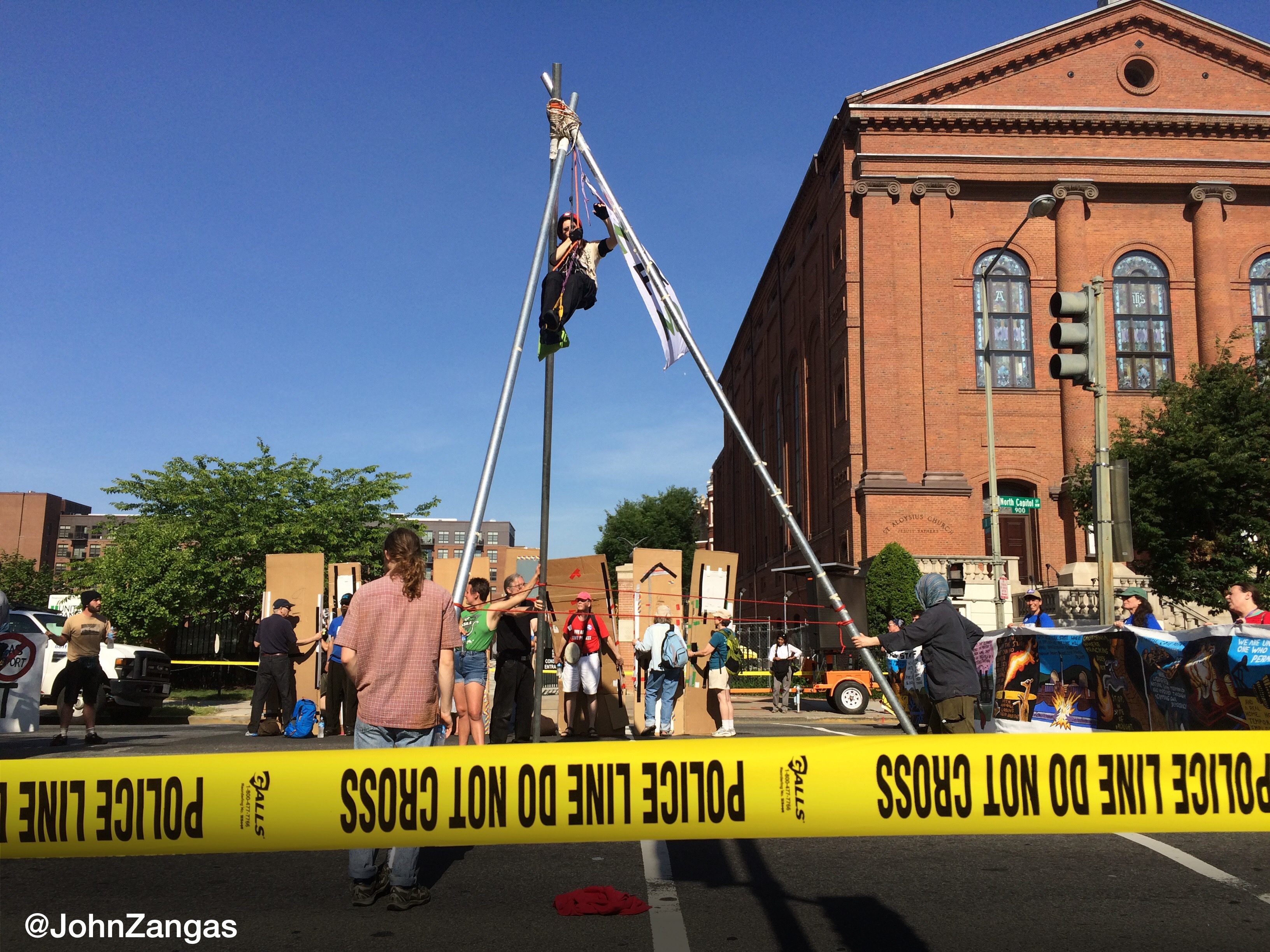 1st Street, Washington DC | May 26, 2015 – Led by frontline community members from New York State, Maryland, Western Pennsylvania and many more, protestors held a rally and shut down a major traffic hub in downtown Washington, DC to protest the Federal Energy Regulatory Commission (FERC). Organizers said they were there to protest the agency that is directly responsible for permitting and approving numerous fracked gas pipelines, compressor stations and import/export LNG facilities from coast to coast. Roughly 100 protestors assembled and blocked the entrances to the Federal Energy Regulatory Commission using giant images of the families impacted by FERC approved projects, and set up a 18 ft. tall tripod in the middle of North Capitol Street around the corner from the FERC headquarters, which stayed up (with an activist suspended inside) for over an hour, blocking traffic and holding an impromptu teach-in about fracking’s impacts in the middle of the avenue. This disruption provided time, space, and a platform from which the stories of five of our front-line community family members were able to be delivered; Tracey Eno from Maryland, Hattie Nestel from Massachusetts/New Hampshire; Heidi Cochran from Virginia, Maggie Henry from Pennsylvania, and Faith Meckley from New York State. These resistance leaders and community safety, health, and rights defenders represent various phases of fracked gas industry exploitation and systematic #communicide: fracking wells, transmission infrastructure (pipelines/compressor stations), storage facilities, and export terminals for liquefied natural gas (LNG). Police blocked off the area but there were no arrests.