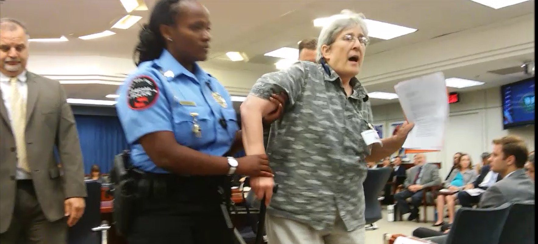 We’re physically weak mainly because of the water-only diet but also because we’ve been conducting this hunger strike on the sidewalk in the hot sun in front of FERC, the Federal Energy Regulatory Commission, from 7 am to 6 pm every work day. We’ve been leafletting and talking to FERC employees, including, several days ago, Norman Bay, the chairperson. We’ve been leafletting and talking to passers-by and people who come to visit, as have Tim DeChristoper, Medea Benjamin, “No Impact Man” Colin Beavan, local high school students, and more.