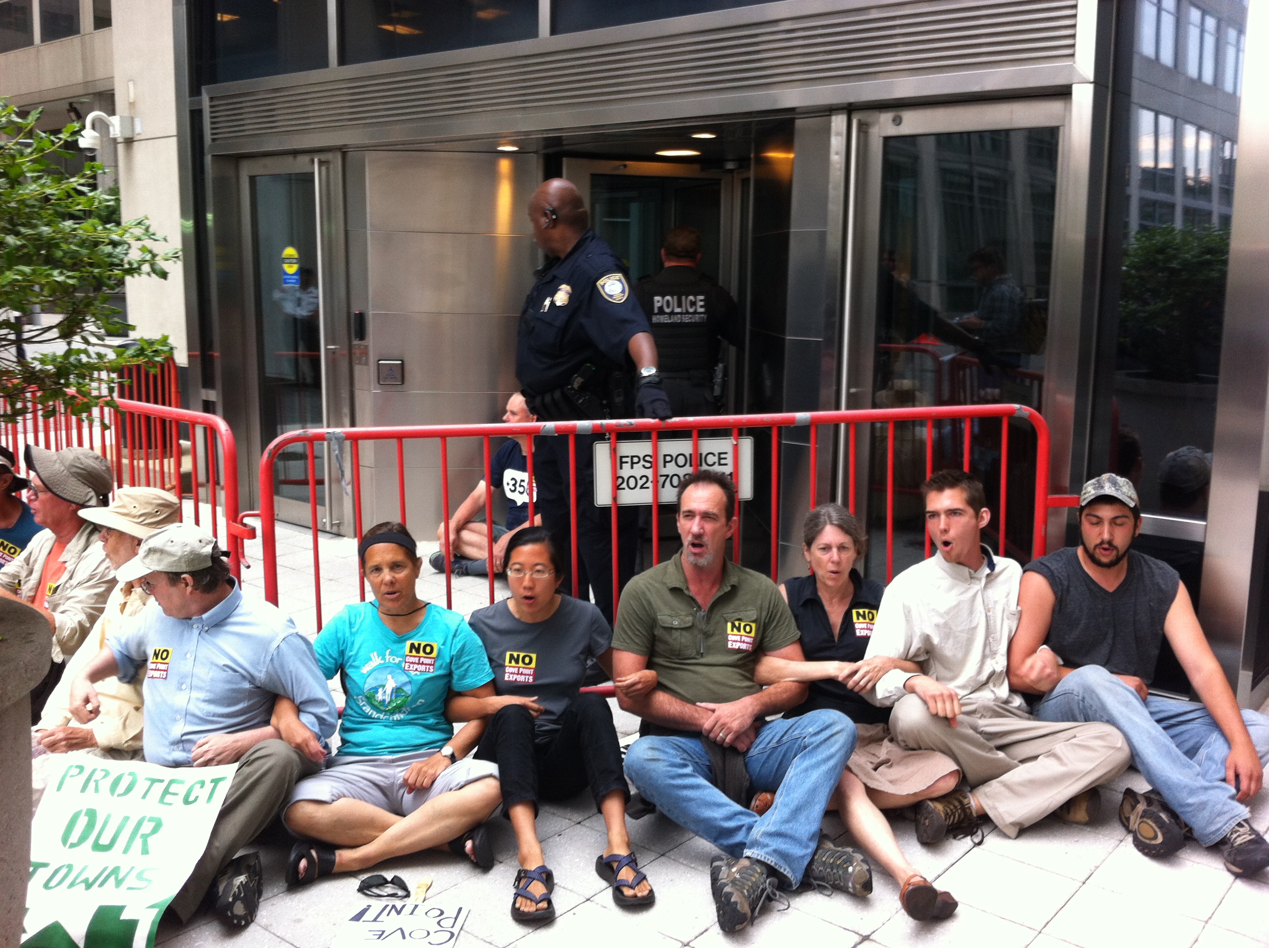 Federal Energy Regulatory Commission (FERC) not permit liquified fracked gas exports from Dominion Resources’ Cove Point terminal in Maryland. Following a rally and march of more than one thousand people on July 12, twenty-five of us returned to FERC the next day for a nonviolent sit-in occupation.